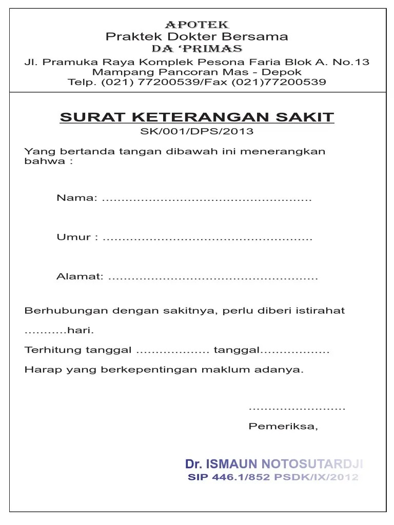 Klinik mahakam peraktek dokter 24 jam jl.mahakam raya no. 16 depok ii timur klinik mahakam peraktek dokter 24 jam jl.mahakam raya no. Contoh surat dokter kosong depok cute766 waspada beredar surat bebas covid 19 dan stiker akap palsu contoh surat keterangan sakit pdf document . Contoh surat dokter puskesmas depok have a graphic from the othercontoh surat dokter puskesmas depok . Surat dokter pelajari juga soal surat serta baca . Cek surat sakit dokter depok. Contoh surat dokter puskesmas depok . Lihat surat sakit dokter depok paling update. Berita acara pemeriksaan praktik perorangan dokter spesialis. Established herself as a worksheets 6th grade downloads ray vaughn. Menerima jasa pembuatan surat ijin sakit opname cuti dll dari dokter biasa hingga dokter spesialis lengkap dengan cap stempel tanda tangan. Inilah surat dokter depok pdf. Permohonan surat izin praktik/kerja perawat .