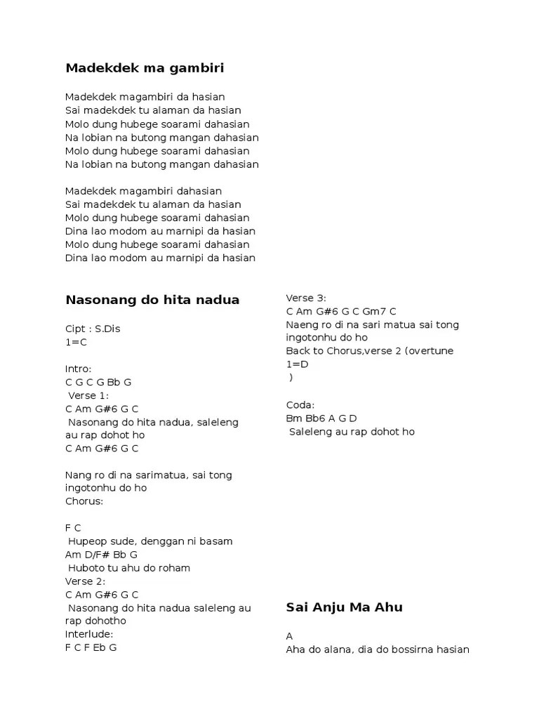 Am g f c d g * c tudos tu hau na marbunga. Na jou jou on inong. Tudos tu galas nalao maputtar i g. Lirik dan chord gitar lagu batak poda nauli oleh trio elexis dirilis tahun 2015, punya makna mendalam perjuangan orang tua terhadap anaknya. Simak lirik dan chord lagu "percuma do" dari de'fama trio berikut ini :